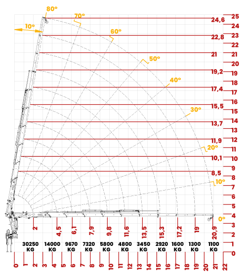 O guindaste 60.500 é ideal para projetos de grandes portes, como pontes, montagens de galpões, operações portuárias, pedágios e resgates. Com 6 lanças hidráulicas e 3 manuais, oferece versatilidade adaptável às necessidades específicas do trabalho. Destaca-se pela capacidade máxima de carga de 14.000 kg e pelo ângulo de elevação de 80° garantindo eficiência em cada operação. O guindaste possui giro completo de 360° e suas sapatas se abrem até 8.039 mm, proporcionando uma base estável e segura. |