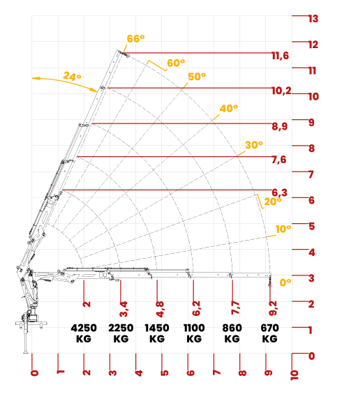 | O guindaste articulado, modelo trave 8500, possui um ângulo de giro completo de 360° graus, além da habilidade de inclinar sua lança a um ângulo de giro de 66° para operações precisas. Sua primeira lança tem uma capacidade de até 2250kg, enquanto suas sapatas dianteiras oferecem flexibilidade de 3242mm. |